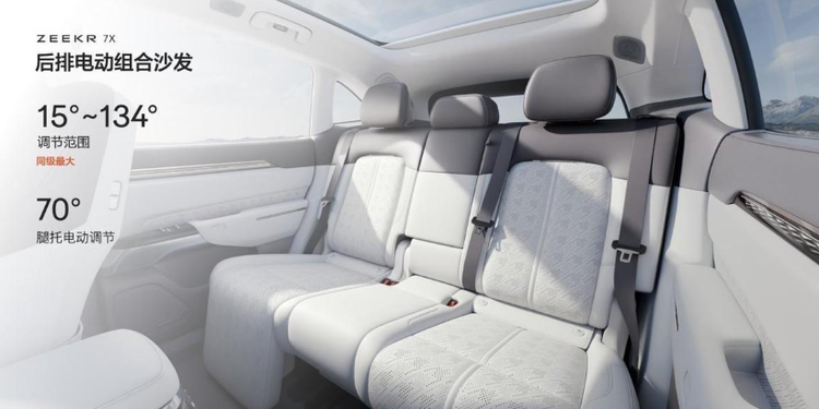为响应用户对于二排豪华配置的需求,极氪7X提供了后排座椅套装和后排屏幕套装,百万级电动沙发,拥有同级唯一的电动滑轨,215mm前后滑动距离,连体式腿托,靠背联动可达15°~134°同级最大调节范围,还拥有通风、加热功能,以及6种SPA级按摩模式。同时全系标配了同级尺寸最大的物理防晒电动遮阳帘,后排侧窗同级唯一可电动升降的双侧隐私遮阳帘,为SUV实现MPV化的“豪华升舱”。