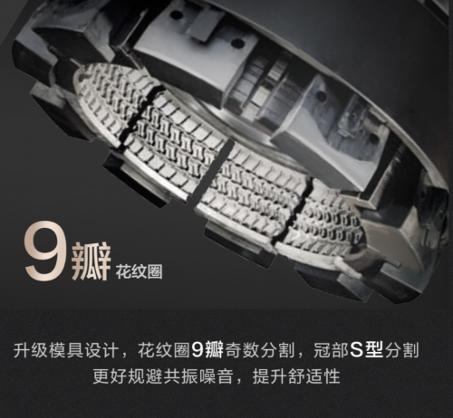 并且在胎面的花纹分模设计上,将胎纹分为九个小区域,每个区域的花纹结构稍有不同,避免产生单一频率的低频噪音。这种设计能够降低低频共振噪音,使乘坐感更加安静舒适,是东风胜利 EV 系列轮胎的“静音杀手锏”。