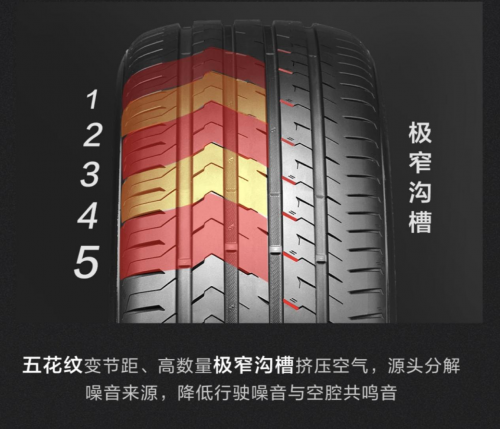 首先就是轮胎的花纹,很多朋友以为轮胎的花纹就是为了增加抓地力,其实静音也是花纹的重要作用之一,胜利 EV 系列使用了五花纹变节距设计,所有胎纹并不是简单的对称排列,而是经过复杂的无机序列算法优化,形成不规则排列。打破传统的中央肋条上的宽横沟设计,使用钢片和窄横沟设计,降低空气挤压所产生气柱共鸣噪声,从源头降低噪声能量这种设计能够有效分散噪音频率,使胎面与地面的接触压力更加均匀,从而减少胎纹与地面摩擦产生的噪音。此外,该设计配合模拟仿真系统,使轮胎的整体静音性能进一步提升,达到新能源车型对安静驾驶的需求。