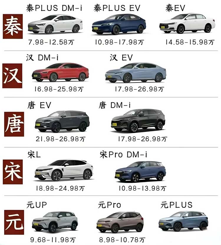 对于比亚迪一路开挂的节奏,大家也都佩服得无以复加。很多人都说,其中一个重要原因就是比亚迪的车名字起得好,它把中国历史上的盛世王朝,比如秦、汉、唐、宋、元,都变成了自己车型的名字,真的是太有创意了!