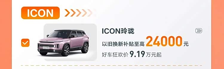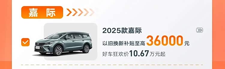 吉利ICON玲珑的以旧换新补贴至高2.4万元,优惠后价格为9.19万元起。2025款嘉际的以旧换新补贴至高3.6万元,优惠后价格为10.67万元起。