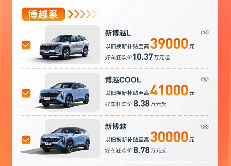 博越系方面,博越L以旧换新补贴至高3.9万元,优惠后价格为10.37万元起;博越COOL以旧换新补贴至高4.1万元,优惠后价格8.38万元起;博越以旧换新补贴至高3万元,优惠后价格为8.78万元起。