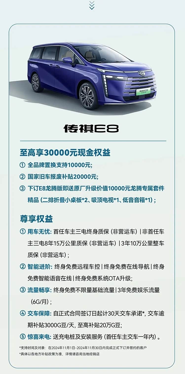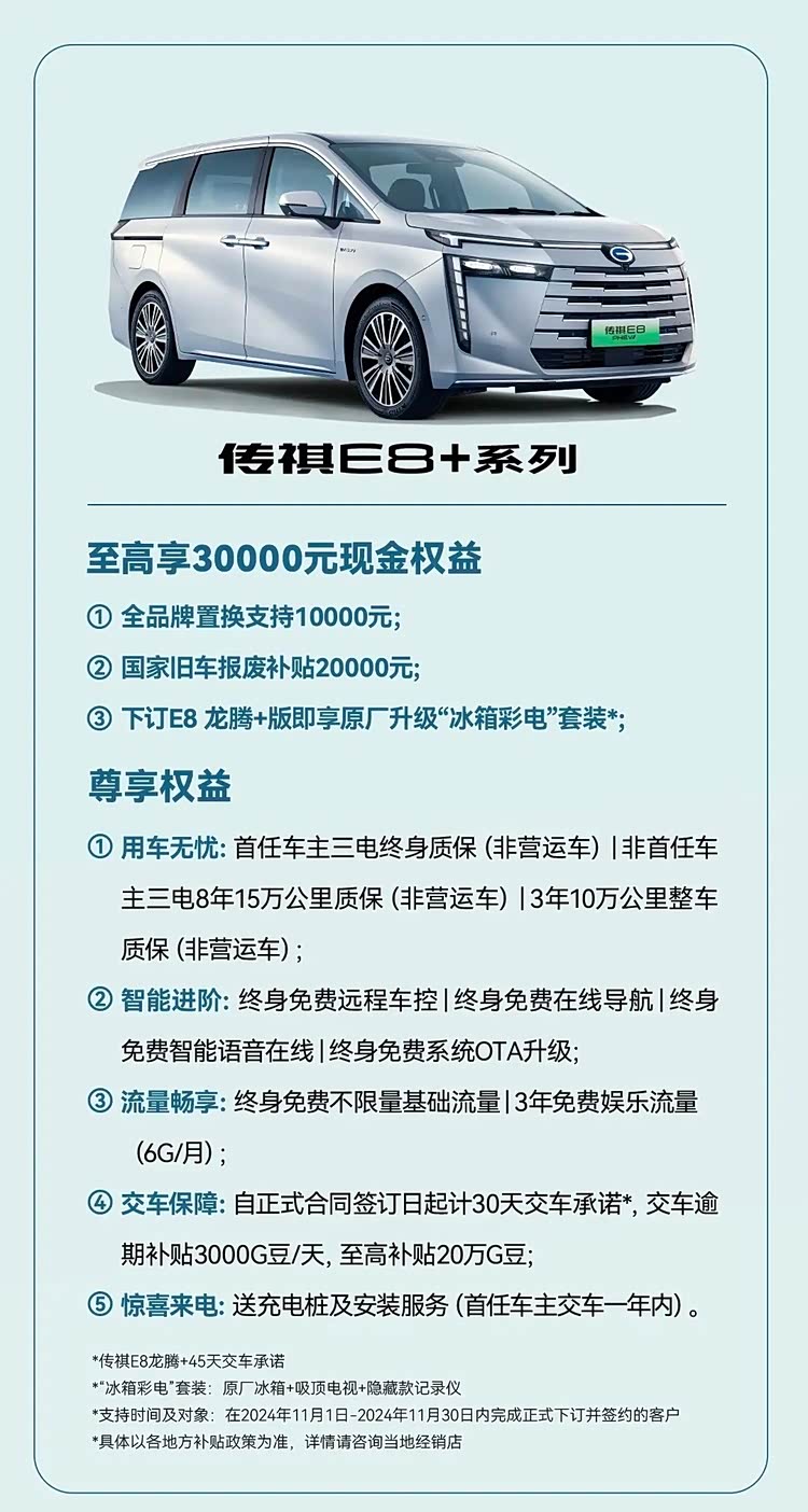 购买传祺E8+ PHEV享受最高3万元置换补贴,包含国家“以旧换新”补贴2万元、厂家全品牌置换补贴1万元,首任车主三电终身质保、非首任车主三电8年15万公里质保、3年10万公里整车质保(非营运车),购车首年可享受充电桩配备及基础安装服务,终身不限量基础流量、3年免费娱乐流量(6G/月)。另外,下订传祺E8 龙腾+即享原厂“冰箱彩电”套装。