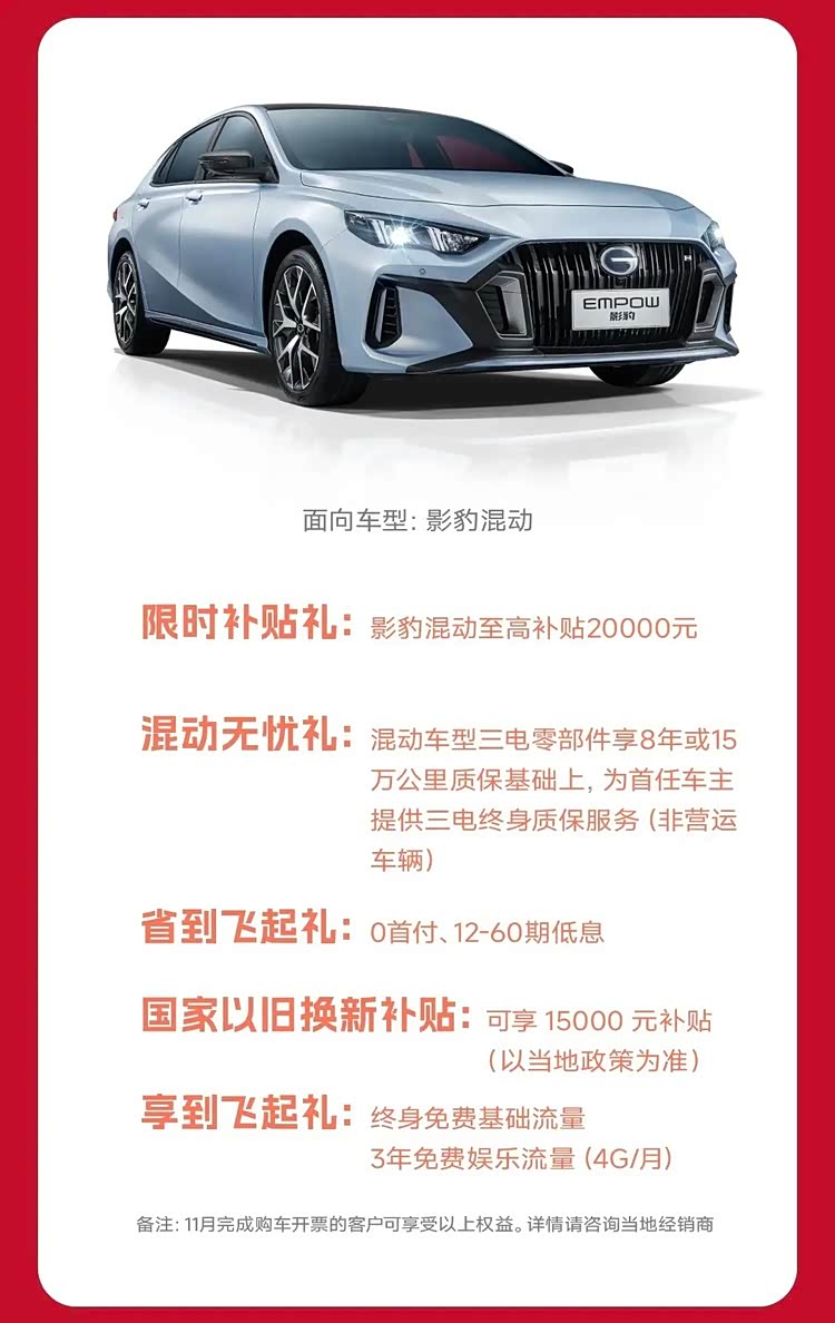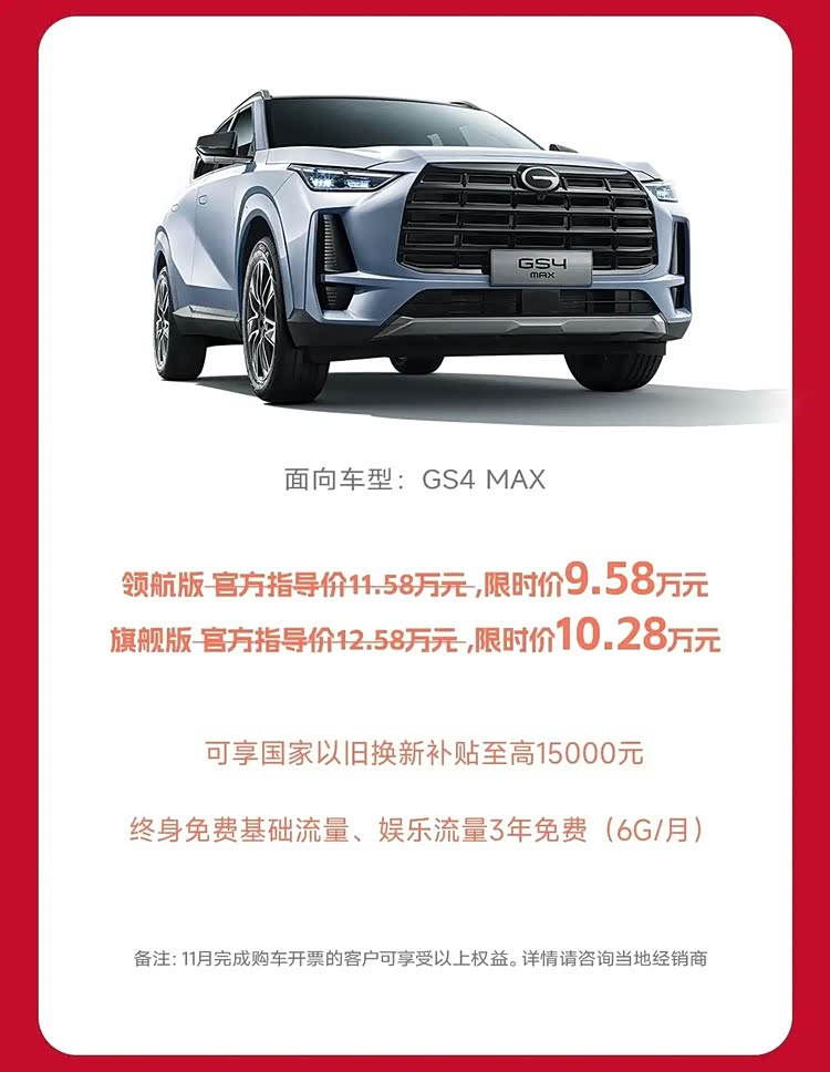 传祺GS4 MAX可享国家“以旧换新”补贴最高1.5万元、终身免费基础流量、3年免费娱乐流量(6G/月)等权益。传祺影酷当前的指导价区间为11.98万-16.98万元,可享国家“以旧换新”补贴1.5万元、传祺加码置换补贴至高6000元,影酷燃油还提供限时至高补贴2万元、影酷混动提供限时至高补贴3万元,混动车型三电零部件享8年或15万公里质保、首任车主享三电终身质保(非营运车辆),流量政策与传祺GS4 MAX一致。