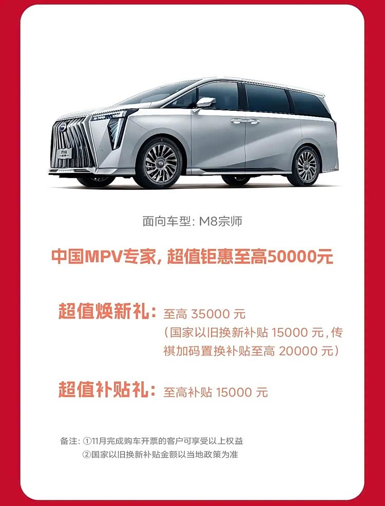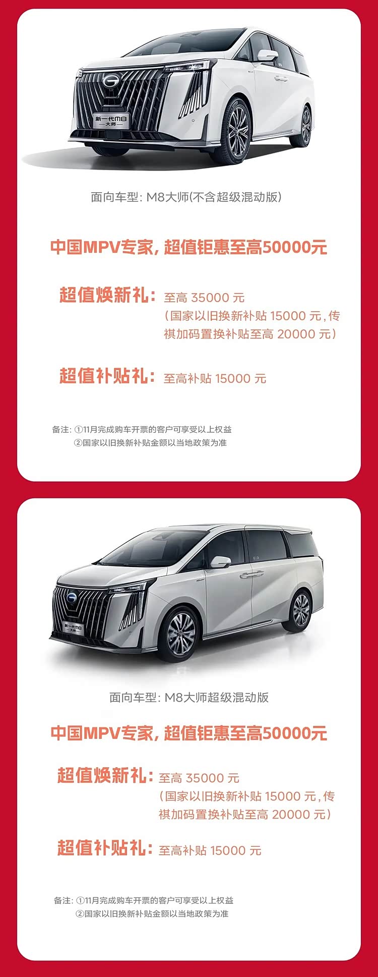 传祺M8当前的指导价区间为17.98万-34.28万元,根据车型不同,购车权益略有差异,但均提供国家“以旧换新”补贴1.5万元、传祺加码置换补贴至高2万元,包含M8领秀系列、M8大师系列、M8大师超级混动版、M8宗师等。