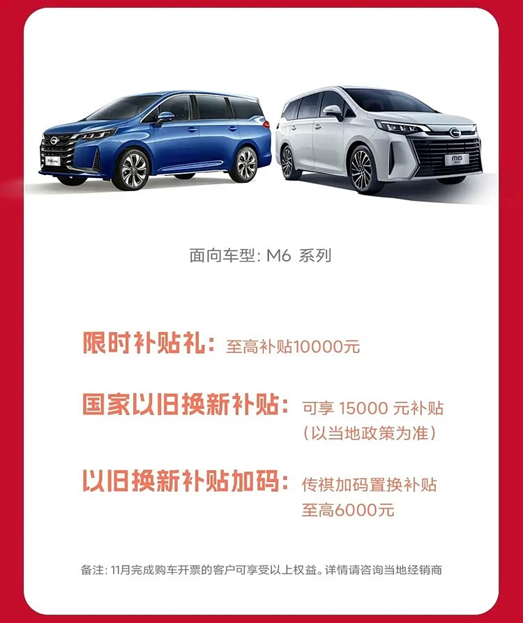 传祺M6系列当前的指导价为11.98万-15.98万元,可享国家“以旧换新”补贴1.5万元、传祺加码置换补贴至高6000元,还提供限时至高补贴1万元。