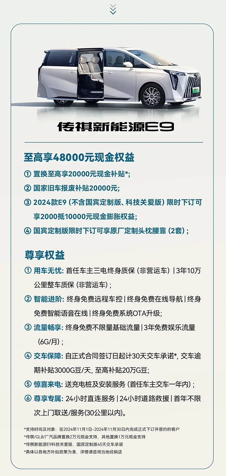 传祺E9 PHEV当前的指导价区间为31.98万-40.98万元,购车可享国家“以旧换新”补贴2万元,广汽品牌/传祺品牌/别克GL8车主置换可享厂家补贴2万元,其他车主置换可享厂家补贴1万元。活动期内下订还有2000抵10000元现金膨胀权益(不包含国宾定制版、科技关爱版),国宾定制版限时下订可享原厂定制头枕腰靠(2套)。同时还有终身免费远程车控、在线导航、智能语音在线、OTA升级、不限量基础流量,3年免费娱乐流量(6G/月)等权益。