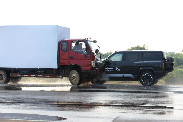 经调研发现,在雨天湿滑、道路狭窄的情况下,对向行驶车辆的驾驶员容易因视线受阻而发生对碰事故,是造成高危事故的典型案例。并且由于大货车、重卡等重型车辆自重大、重心高等特点,更让这一路况下的危险系数呈指数级上升。而中汽中心也将挑战难度直接拉满,让豹8模拟了雨天湿滑路面下,以90km/h相对速度与4.5吨重大货车发生50%偏置碰撞,并跌落8米深坑的极限工况场景测试,全面验证豹8的安全品质。