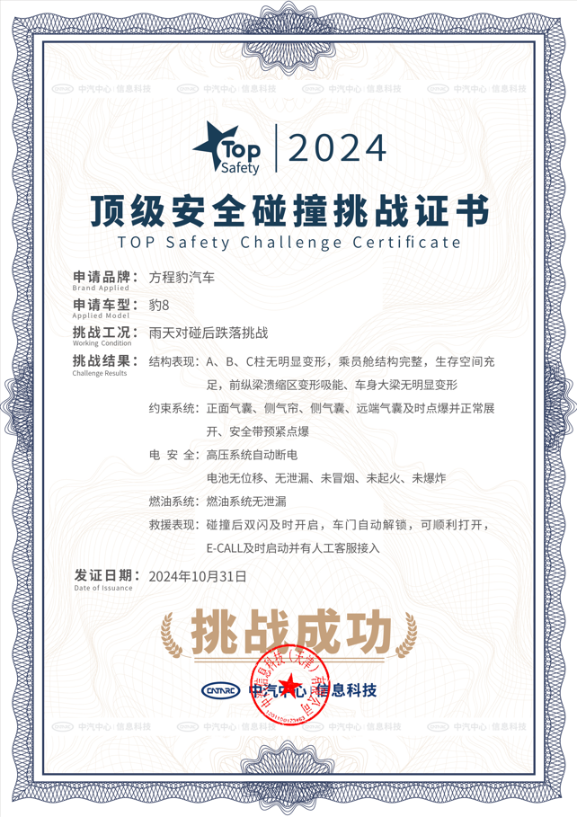 近日,方程豹 豹8(参数|询价)凭借安全硬实力,成功通过中汽中心顶级安全碰撞挑战。依托电芯安全、结构安全、车身安全、安全配置的全面优势,豹8表现出受损低、高硬度、强稳定的产品优势,全网首次雨天对碰后跌落挑战成功,彰显出极致硬核的全维安全表现。