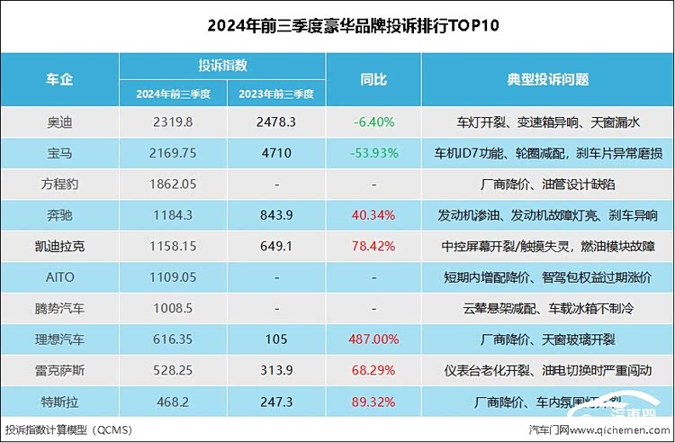 随着2024年前三季度投诉指数发布,汽车门网总结了车企、车型、发动机、变速箱等细分领域外,也针对豪华品牌的投诉指数进行数据整理。豪华品牌投诉排行TOP10中,奥迪、宝马、方程豹分别位居投诉榜单前三名。其中,奥迪因车灯开裂、变速箱异响、天窗漏水等问题位居投诉榜单第一名,宝马因车机ID7功能、轮毂减配和刹车片磨损等问题位列第二。方程豹因厂商降价、刹车油管设计缺陷等问题居投诉榜单第三名。理想汽车因厂商降价、天窗玻璃开裂遭车主集中投诉,同比上涨487%,成为上涨幅度最大的豪华品牌。