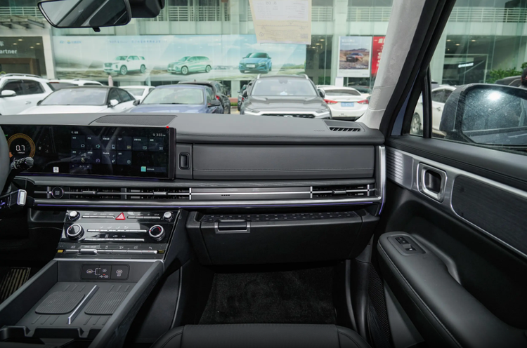 内饰方面,中控台设计非常居家,尺寸优势所带来的宽敞通透感,在其它小尺寸车型上是体验不到的。四辐式方向盘包裹着打孔真皮,握感非常出色,在后方配备了旋钮式换挡机构。空调温度是旋钮控制,其余温度相关功能则是触控按键,然后上方一排是多媒体和车机控制区,而下方则是车辆功能、驾驶模式的控制区,所有常用功能都包含在内了,主打一个实用。