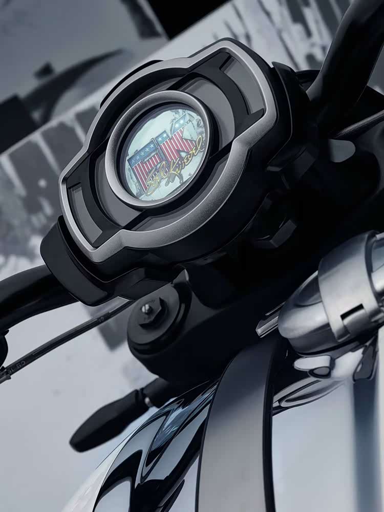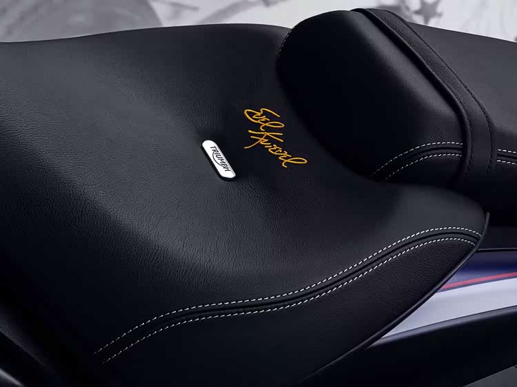 这次的限量版 Rocket 3 采用了以红、白、蓝三色构成的涂装,像是 Knievel 经典的星条旗战袍重现。 油箱更是镀铬处理,与车尾黑色车身上的图案交相辉映; 皮革座椅上绣有金线 “Evel” 签名,搭配车头泥板和侧面板上的标志,连仪表板启动画面也展示了他的经典签名和星条旗 “EK” 标志,每个细节都彰显出对这位特技传奇的尊敬。