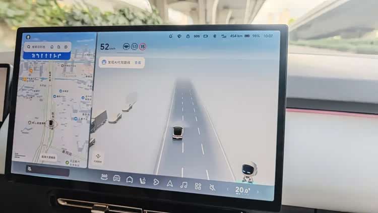 后面,我重点体验了一下这台车的纯视觉城区智驾,开启的方式很简单,先导航一个想去的地方,利用导航规划行径路线之后,连续两次将怀挡拨动到D档就能启动。从启动方式来说,它的实用性要比此前我体验过的极氪001的记忆领航模式更广,极氪智驾方案的问题在于,只能记忆20条路线,每条路线100km,首次使用前还需要自己先沿着规划路线跑一遍才行,这个操作逻辑其实和大疆用在宝骏和奇瑞的一些车型上的那套更低价的纯视觉方案几乎一模一样。此外,当路上的车道线变模糊后,车子自动就从NGP模式下降到了LCC模式,并发出语音提醒,让司机主动接管车辆,这个设定应该还是为了安全考虑,毕竟在车道线不明的情况下,纯靠车辆本身的摄像头开车还是存在一定的危险性。