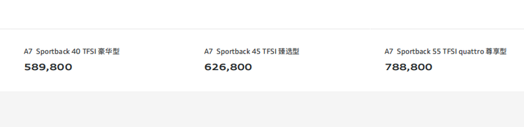 动力方面,2025款奥迪A7 Sportback 40TFSI豪华型搭载最大功率150千瓦、峰值扭矩320牛·米的2.0T涡轮增压发动机;A7 Sportback 45TFSI臻选型搭载最大功率195千瓦、370牛·米的2.0T涡轮增压发动机;A7 Sportback 55TFSI quattro尊享型搭载3.0T V6发动机以及48伏轻混系统,最大功率250千瓦,峰值扭矩500牛·米,传动系统均匹配7速S-tronic自动变速箱。