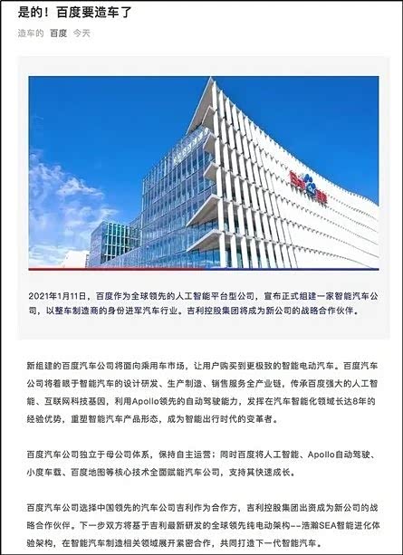 2021年1月11日,抢在小米下定决心官宣造车前两个月,早就在自动驾驶领域布局多时的BAT互联网三巨头之一的百度,高调官宣要亲自下场“造车”了。