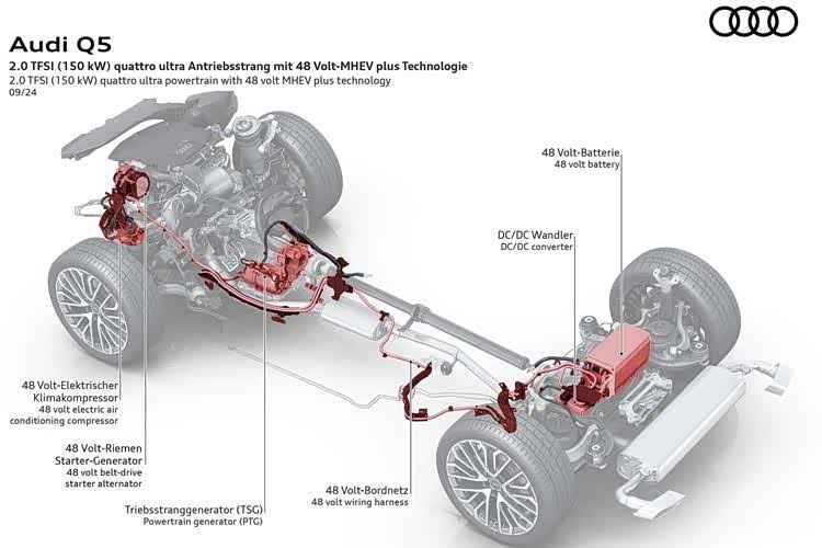 除了发动机本身,全新PPC平台还针对动力总成进行更深度的电气化改造,这台A5L整车采用48V电气系统,通过位于后桥的电池供电(容量1.7kWh)供电,不光在发动机皮带轮系使用P0布局的BSG电机(和A8L差不多意思),还在双离合变速器输出端加装了P3布局的电机(TSG+PTG)。