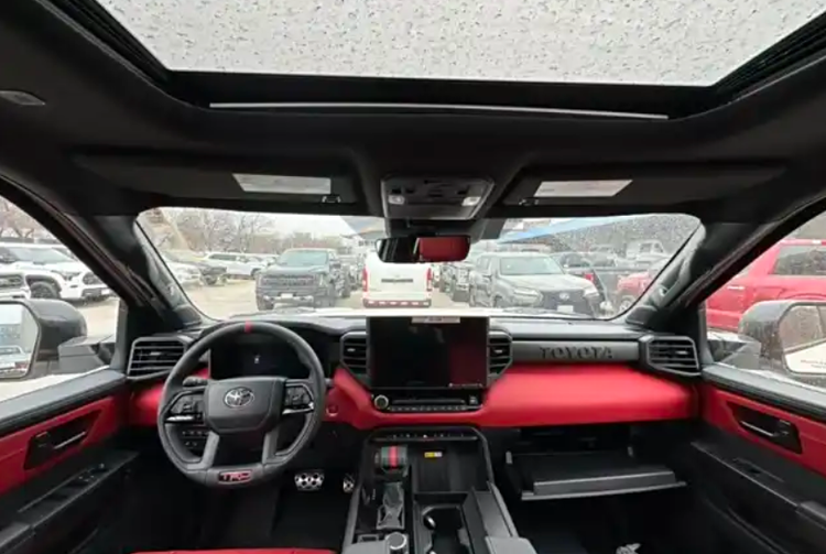 进入到内饰,这款TRD版的红杉算是彻底放开了自我,独有的红黑配色确实不是一般人能够把持得住的,但其专业元素可没有丝毫的降低!比如方向盘换用了四幅式的设计,为保证其实用性,按键还是采用了物理设计,显示区为两只超大尺寸的液晶屏!中控台也换用了多层结构,副驾驶前侧的TOYOTA则表明了身份!
