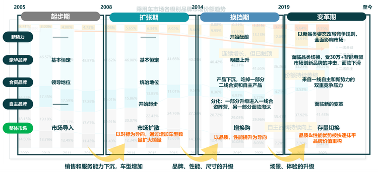 对比此前20余年形成的四个周期,市场起步期主要解决的是高线级城市家庭一部车的无有问题。到了市场的扩张期,主题变成了面向低线级城市快速下沉,同时尽可能多地推出便宜、实用的普及型产品。很多合资品牌的多代同堂策略在那个阶段都曾大获成功。但是随着时间进程扩过2014年,市场需求主题突然变成了增换购驱动的消费升级,那些依靠普及型产品获得增长的车企一下子全都哑火了。这一阶段凡是把品牌向上作为首要任务的车企基本上都获得了远高于市场平均水平的增长。再后来就是最近几年我们天天念叨的智能电驱化变革,当然早期愿意尝鲜的用户大概率也是消费能力足够强,并且认知开放的中高端用户。如今随着以“移动的家”为主题的智能电驱车产品在主体形态上趋于收敛,而且市场渗透率也开始超过了50%,这也将预示着一个新的周期正在形成,或者说车企必须更有前瞻性地找到下一个增长点。