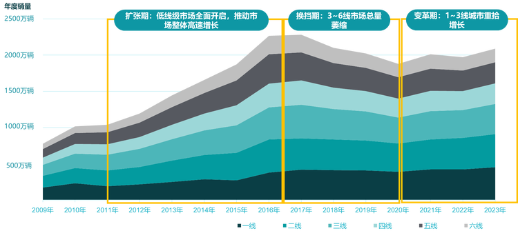 从过去十几年的数据层面我们也能看到不同周期各线级市场总量的变化:下图是各线级城市年销量形成的堆积图。可以看到市场扩张期增量主要来自3-6线城市。而到了换挡期,萎缩最快的也是这些城市。因为这些市场的持续消费能力不强,对车辆的实际使用需求也不高。比如一个一线城市的家用车,每年行驶里程大概在1.5~2万公里左右,而6线城市通常只有3000公里上下。一方面是由于这些地方出行半径更小,替代方案就会更多。另一方面也是因为油价相对这些用户的收入而言,负担私家车的使用成本确实也很吃力。就像网上一个段子流传的那样,广东打工人的车,每年只加两箱油,一箱用于回老家,另一箱用于从老家开回来……