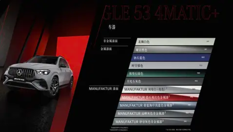 2025款AMG GLE SUV和轿跑SUV的车身颜色选择已经增加到11种,并用MANUFAKTUR贝母白(亮色)车漆替代了MANUFAKTUR钻石白(亮色)车漆。此外,还新增了MANUFAKTUR蔚蓝海岸的浅蓝色金属漆和MANUFAKTUR矽谷的灰色非金属漆。