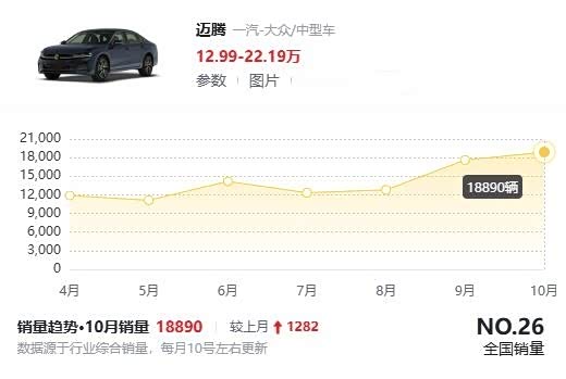 全新一代迈腾的9-10月销量分别为17608台和18890台,相比前几个月,销量提升很大,比如在4-8月份,这款车的销量也能过万,但远远不及9-10月份的销量高,这就说明新车换代后,竞争力变得更强了,所以才说一汽大众全新一代迈腾是最成功的换代。