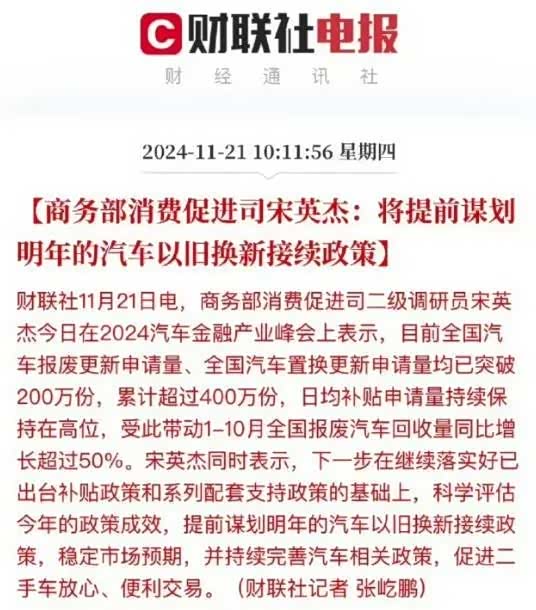 近日,国家发改委举行11月份新闻发布会,期间发言人李超透露,将研究提出未来2025年继续加大支持力度、扩大支持范围的“两新”(大规模设备更新和消费品以旧换新)政策举措,待履行相关程序后适时公开发布,持续以“两新”政策推动群众受益、企业获利、经济向好。