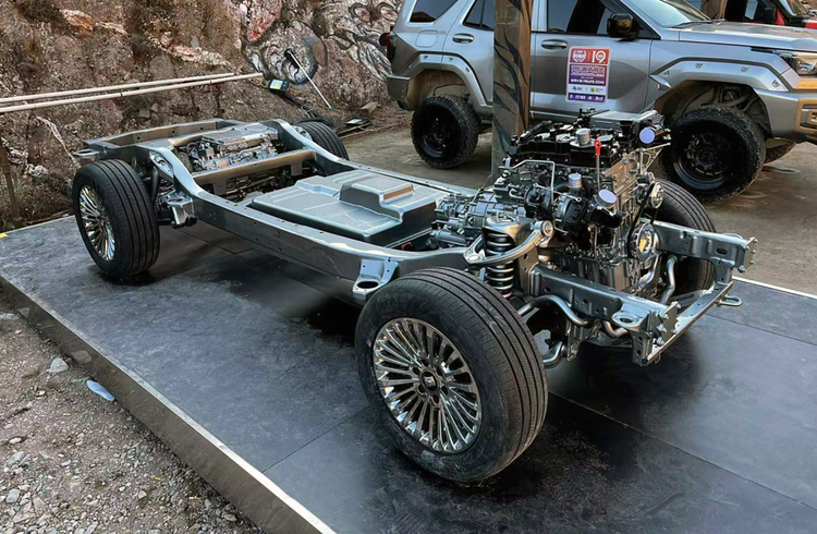 可以将非解耦混动四驱理解为燃油车传统纵置四驱平台加上电动机,可以实现单电机驱动,也能够实现混动。这种结构的优势是保留了分动箱的“低速扭矩放大”模式,越野时的动力可以数倍放大。同时以发动机为主要动力单元,长时间高强度越野不用担心电动机达到极限——电动机按照最大功率输出的时间一般不能超过30秒,具体品牌的车辆会有一定差异。