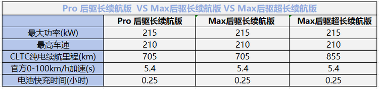 对比这三款车型,Max两款的配置会比pro版丰富,驾乘方面会更加舒适,Max后驱超长续航版和Max后驱长续航版最大差距体现在续航里程上,有2万的差价,其他配置都一样,但是705km的续航足够日常使用了,所以小编会更推荐Max后驱长续航版。