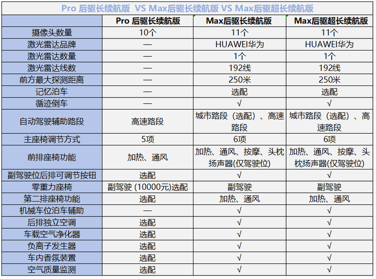 智驾配置上看,Max两款都要比pro丰富,pro很多要么没有要么需要选配,Max后驱超长续航版和Max后驱长续航版各种配置都一样,整体舒适度上会更加好。