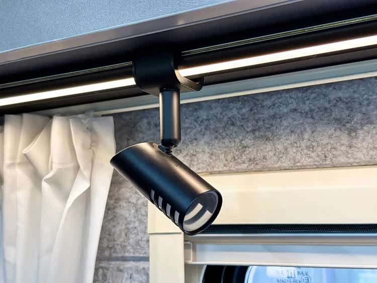 生活区采用了无主灯照明系统,地面匹配了悬浮式灯光,会客区上方还设计了可滑动射灯,灵活便捷,营造出通透明亮的生活空间。内饰以灰色、米白、木纹为主,侧墙板以及地板采用了协调性更高的灰色,整体性十足。