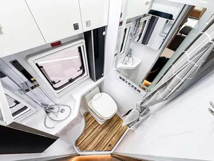 卫浴间设置在车厢中部,采用了吸塑工艺,五边形外观设计不仅带来更宽裕的淋浴空间,还让车厢内部的视觉观感更为柔和舒适。内部匹配了齐全的淋浴系统以及抽拉盒式马桶,此外,还配置了美妆镜、镜面储物柜、防水浴帘等便利性设施,保障了用户舒适的旅居体验。