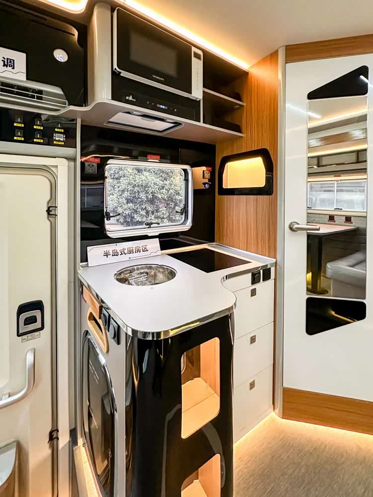 台面右侧和下方还做了带灯光系统的储物格,氛围感十足,拿取放置物品更为清晰明了,并且美观度也很高。此外,下方还内嵌了一台3kg洗烘一体机,旅居时清洗衣物更为方便,提升了用户旅居体验。