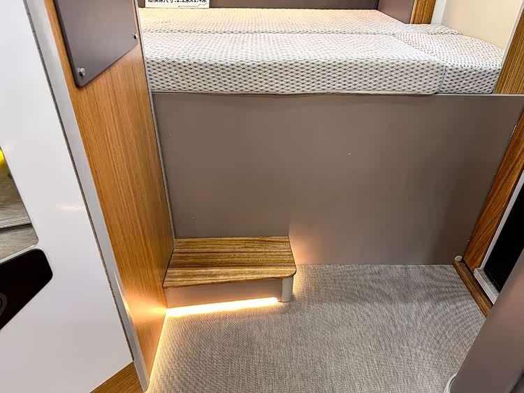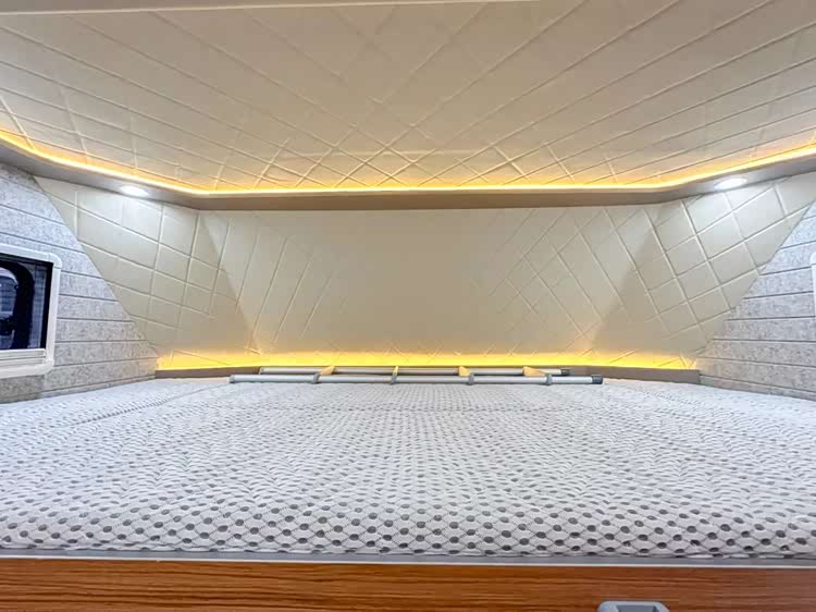 车辆尾部为固定横床,经过后拓结构的拓展,床铺空间可达到2200×1400mm,床铺下方还设计了登床阶梯,底设照明灯带为夜晚提供照明,细节满满。