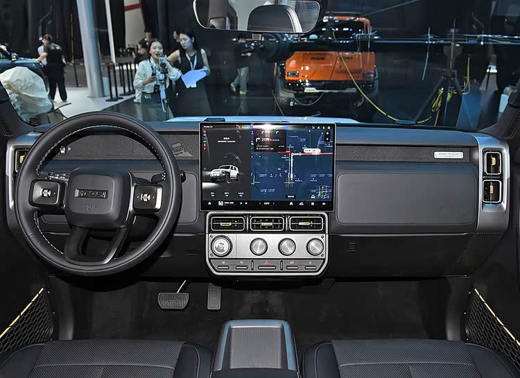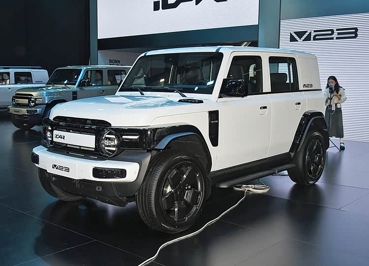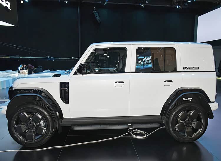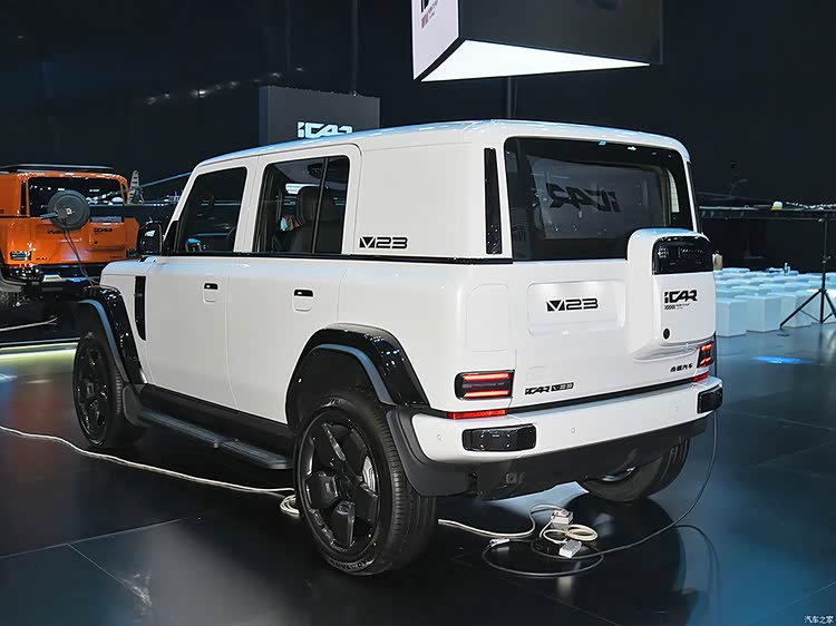 iCAR V23的外观设计充满了硬派越野的气息。车身线条硬朗有力,前脸采用了封闭式设计,搭配圆形大灯组和三段式灯带,不仅提升了车辆的辨识度,更彰显出强烈的视觉冲击力。车身侧面,隐藏式门把手、五辐式轮圈以及加宽的轮眉设计,进一步增强了车辆的运动感和越野性能。车尾部分,“小书包”备胎设计不仅实用,更成为了车辆的点睛之笔,与整体风格相得益彰。
