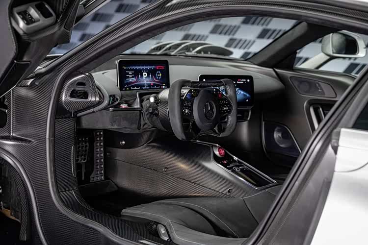 拥有「道路版F1赛车」之称的奔驰AMG One,全球限量275辆,国内仅3辆配额,采用赛车碳纤维单体外壳结合中置引擎布局,车头造型采用AMG代表性设计,前轮拱设有可调节的主动式通风孔,并连结顶部硕大的进气口与后方鲨鱼鳍,搭配极具张力的主动式宽体尾翼,营造出如F1赛车的视觉冲击感。