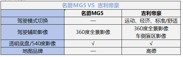 辅助驾驶配置上对比,吉利帝豪标配三种驾驶模式,因此会带来更加多样的驾驶体验,还比名爵MG5多一个高德地图和车测盲区影像,驾驶会更加安全。