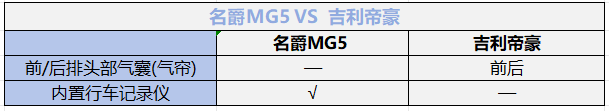 安全配置上对比,名爵MG5比吉利帝豪多一个内置行车记录仪,而帝豪会多一个前后侧头部气囊,两者不相上下