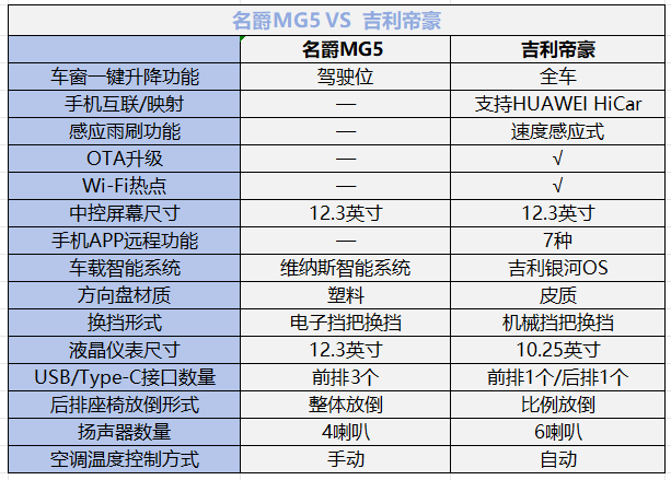 其他配置上对比,整体相对而言,吉利帝豪比名爵MG5要丰富,驾乘感受会更加舒适。