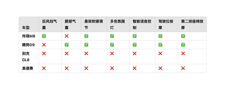 配置方面,我们以指导价34.28万的传祺M8 宗师 双擎御尊版为例,其他三款选取售价接近的车型,进行配置对比,整体来看传祺M8和腾势D9相较于奥德赛和GL8优势相当明显,这也是自主品牌的一贯优势,例如安全层面,传祺M8有后风挡气囊,而腾势D9有膝部气囊; 传祺M8和腾势D9均支持悬架软硬调节,具备多色氛围灯和好用的车机系统以及语音对话,在座椅功能方面,传祺M8和腾势D9均支持驾驶位+后排座椅记忆以及二排座椅按摩,尤其是第二排座椅按摩功能对于一款MPV车型来说相当重要,因为第二排乘客往往是自己的家人和重要的宾客,他们需要更舒适全面的乘坐体验,所以在有加热、通风的基础上,有按摩功能绝对是加分项。