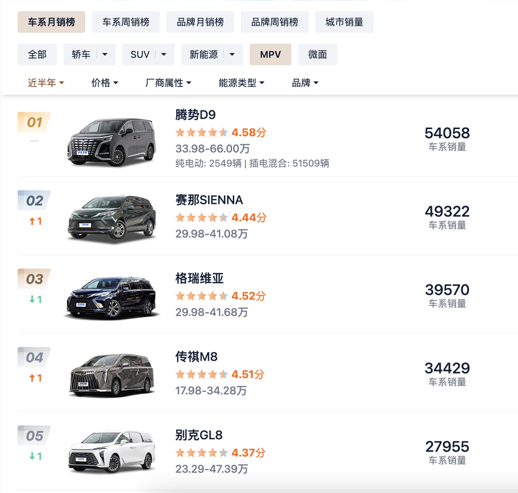 别克GL8可以说是国内商务MPV的经典车型了,售价23.29万-47.39万,提供油电混动和燃油(48V轻混)动力形式,曾经的MPV霸主,如今份额正在被各路选手一步步蚕食,在近半年的销量方面也不敌“后生”—传祺M8。