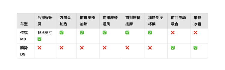 那么售价接近的传祺M8和腾势D9在配置层面其实也各有千秋,两车虽有不同取舍,但传祺M8还是更加领先,例如传祺M8第二排具备15.6英寸的液晶屏,第二排的乘客的娱乐体验更好,同时对于前排乘客也照顾有加,支持方向盘加热以及前排座椅的加热、通风和按摩,前后排做到了平权;而腾势D9则具备前门电动吸合以及车载冰箱功能,这是传祺M8所不具备的,那么综合来看,大家认为孰优孰劣呢?我个人则是更倾向于传祺M8,这里补充一下,传祺M8虽然没有冰箱,但它有可加热/制冷的杯架,也是挺实用的功能。