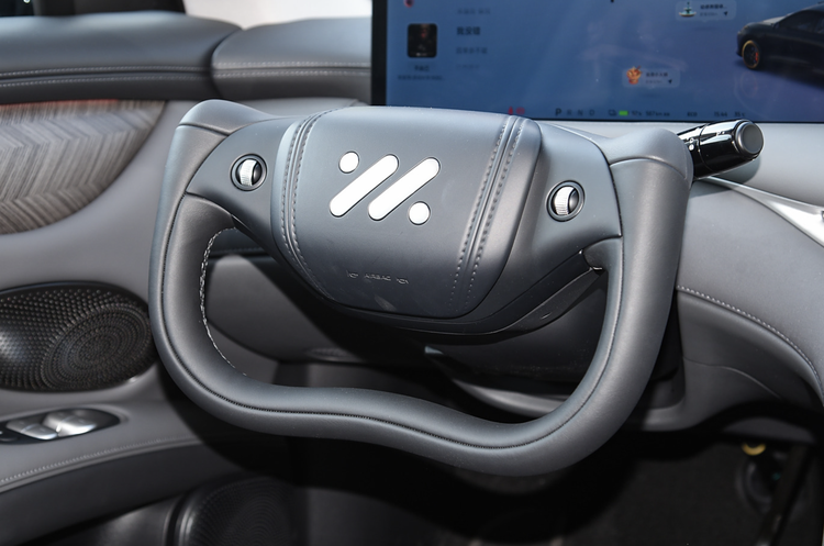 在车内,全新智己LS6依旧保留了旧款车型的优秀设计元素,标配了26.3英寸的超长中控屏和10.5英寸的功能屏,方向盘也是非常独特的半幅式设计。内饰的用料看着也是相当实在,中控台、门板等区域大量使用了软质材料,座椅和方向盘都是真皮材质。