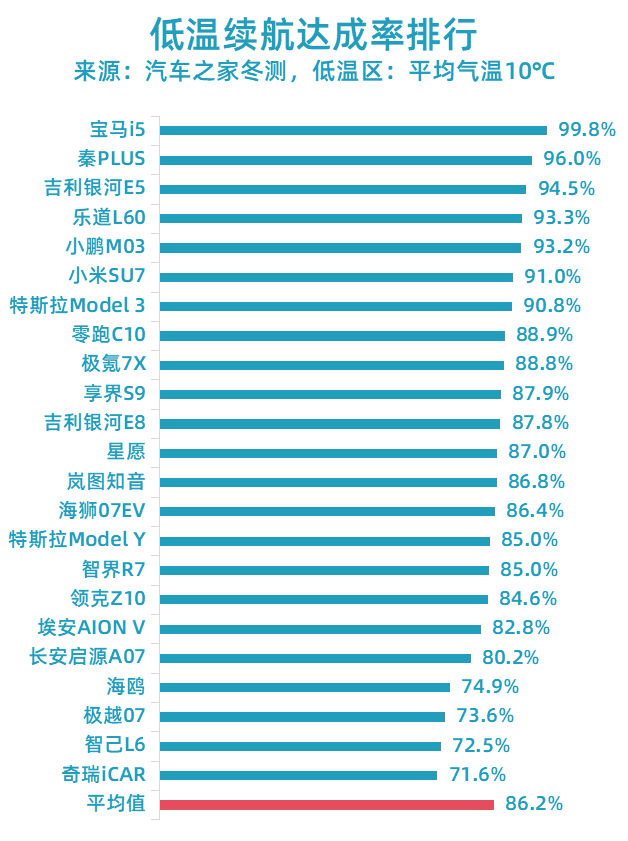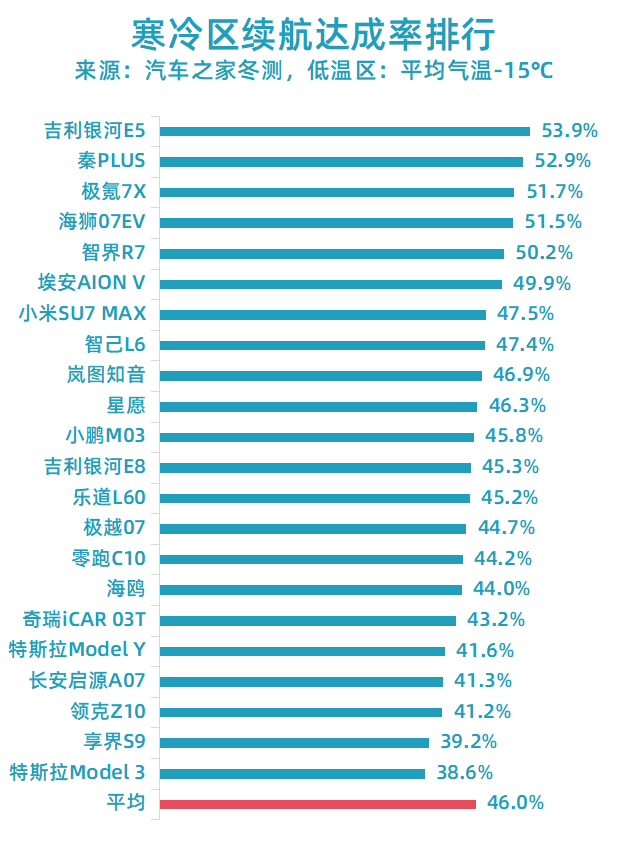 一个例证是,长期以来的全球电动汽车电耗之王——特斯拉Model 3,在寒冷区的续航达成率只有38.6%,排名垫底。其他所有中国品牌车型的表现,都比它好。