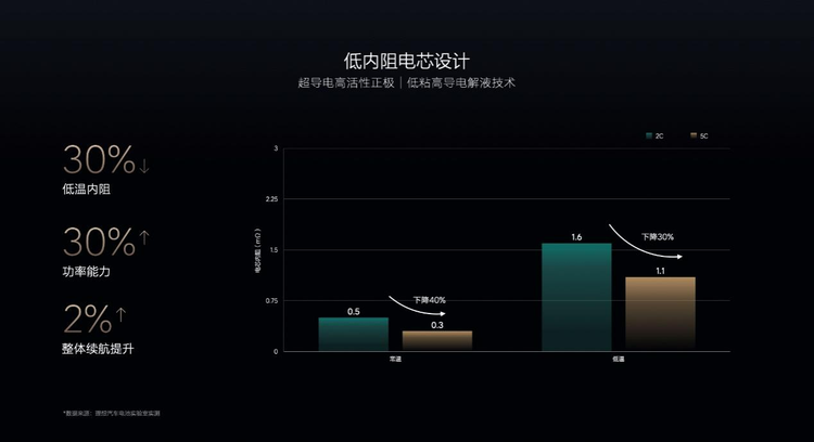 双方降低内阻的方法就像剥洋葱,一层层地拆解内阻的来源,最终拆解到了三个层级共17项内阻成分,再一个一个进行优化可行性分析。最后,通过采用超导电高活性正极、低粘高导电解液等技术,成功将MEGA 5C电芯的低温阻抗降低了30%,功率能力相应提升30%以上。如果放到整车低温续航测试工况来看,这意味着内阻能量损失减少1%,电池加热损耗减少1%,整体续航可以增加2%。