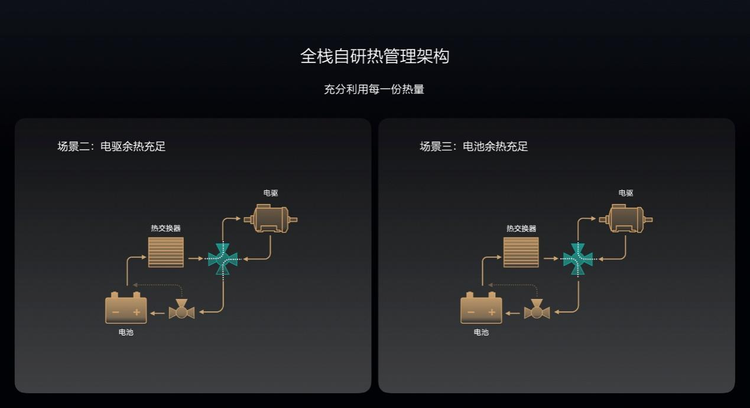 理想这一架构的特点是,能够在多个热源和多个加热需求之间灵活的调配,比如电驱余热可以用来给座舱取暖,也可以存在储存在电池中。