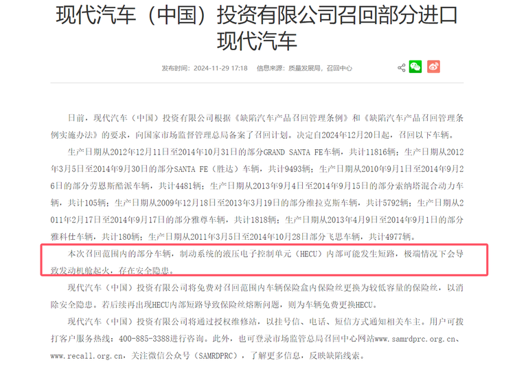 值得注意的是,不久前的11月底,因为同样的原因,现代汽车也在国内车市召回了多款进口车型,涉及到SANTA FE(胜达)、 维拉克斯(参数|询价)、索纳塔混合动力车辆等。
