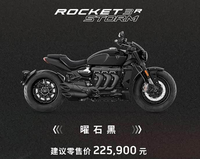 在车身尺寸方面,据曝光的信息可知,凯旋Rocket 3 Storm车型的轴距为1677毫米,座高773毫米,整备质量317公斤。此外,在配置方面,新车全系标配多功能仪表,还配备47毫米Showa倒置前减振、前双320毫米制动盘等,此外,新车还支持多种不同的外观配色可供消费者选择。凯旋这款全新摩托,配2458毫升直列三缸机,起售22.59万如何