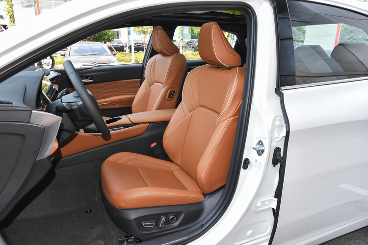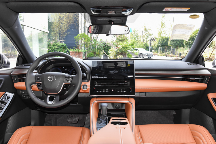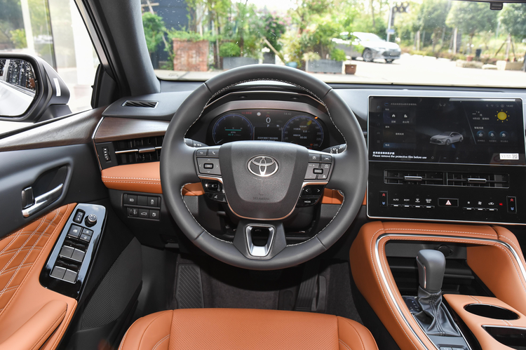 内饰方面是典型的丰田风格,无论是方向盘上密密麻麻的按键亦或是小尺寸的换挡杆看起来都比较熟悉,其中控台采用了隐藏式的空调出风口,整体布局布局也比较简洁。用料方面,中控台上方为搪塑工艺,下部分则是木纹饰板以及皮质包裹,不同的材质在干邑棕以及凝霜灰配色看上去尤为明显,这让它具备了还算不错的质感。