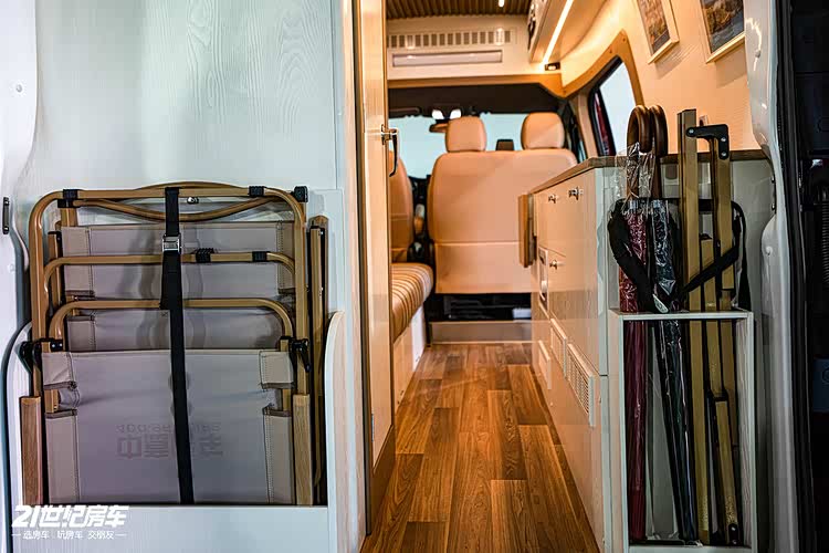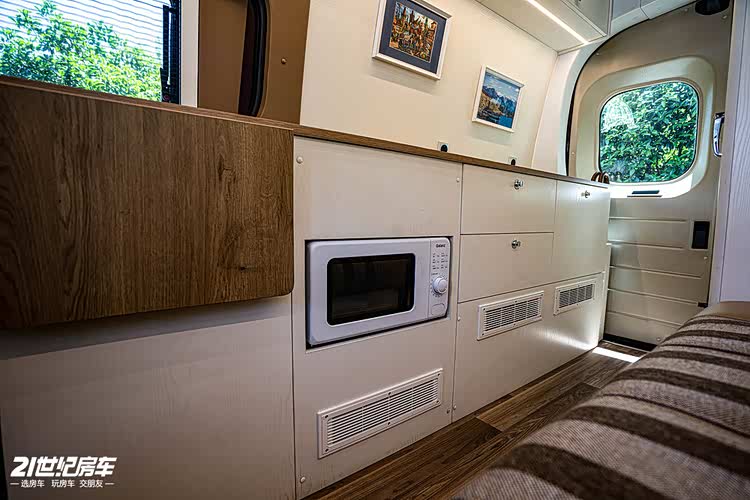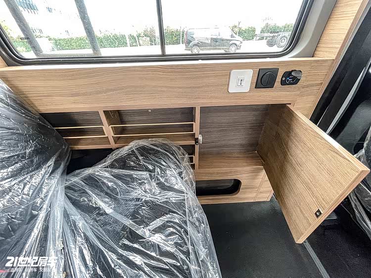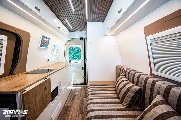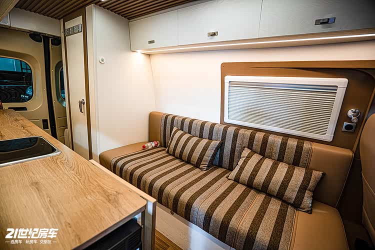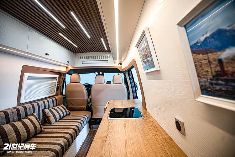 内饰方面,主驾驶后方一个长条沙发,夜晚可变床铺。厨房区台面宽裕,有洗手池、微波炉和外展桌板,车载冰箱设计在进门位置。独立卫浴间提升舒适性及隐私性。车尾设计成收纳区。