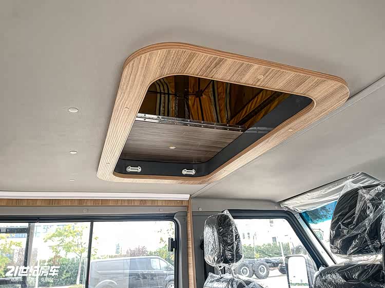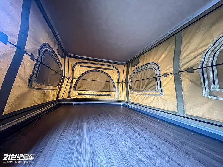 厢体内部简单,有原木饰板、储物空间和可调节座椅,核载 6 人。升顶帐篷为主要休息区,升顶平台可放置充气床垫,满足夜晚睡眠需求,两侧软性篷布可以通过拉链开启通风采光,更适合温度适宜的春秋季旅居露营。